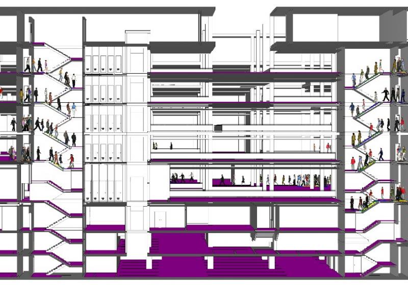 - Évacuation des personnes : L’utilisation d’une simulation dynamique d’évacuation des personnes a permis l’optimisation des espaces en réduisant les largeurs d’escaliers par rapport aux exigences prescriptives, tout en gardant un niveau de sécurité élevé pour les occupants.
